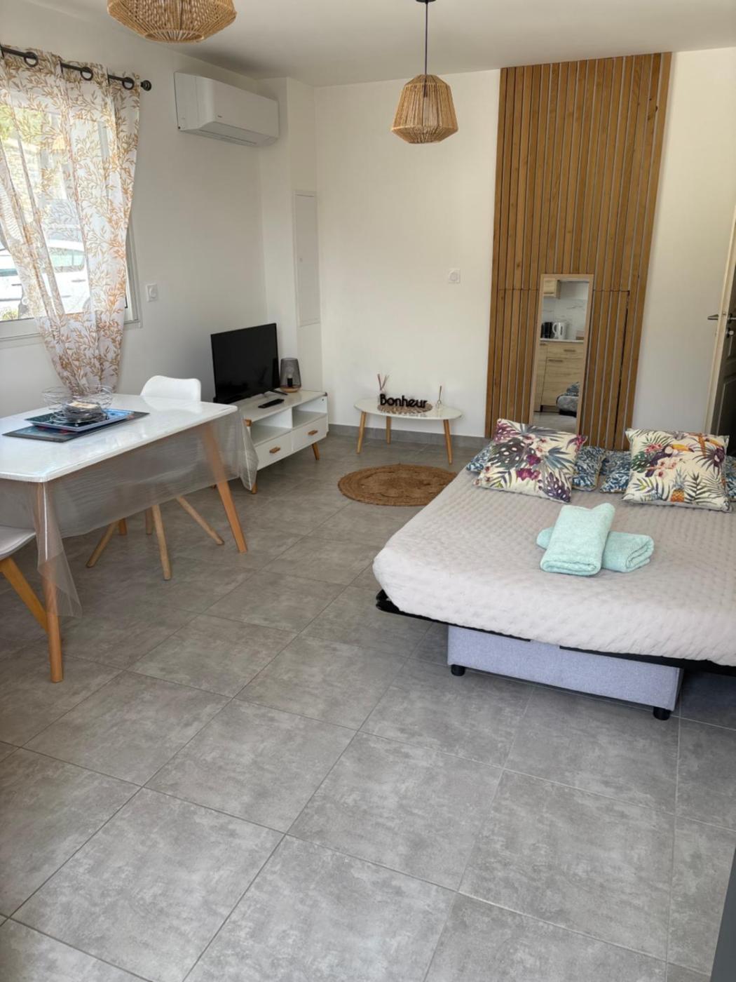 Appartement 1 Chambre. Boasting a private entrance, this air-conditioned apartment comes with 1 living room, 1 separate bedroom and 1 bathroom with a shower and a hairdryer. Guests will find a stovetop, a refrigerator, kitchenware and an oven in the well-equipped kitchen. The apartment also includes a barbecue. Featuring a terrace with garden views, this apartment also features a washing machine and a flat-screen TV. The unit has 2 beds. ;