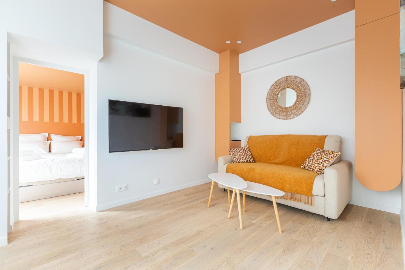 Appartement 1 Chambre. This air-conditioned apartment features 1 living room, 1 separate bedroom and 1 bathroom with a shower. Guests can make meals in the kitchen that has a stovetop, a refrigerator, a dishwasher and kitchenware. The apartment has parquet floors, a seating area with a flat-screen TV with streaming services, a tea and coffee maker, a dining area, as well as a wardrobe. The unit has 2 beds.